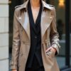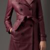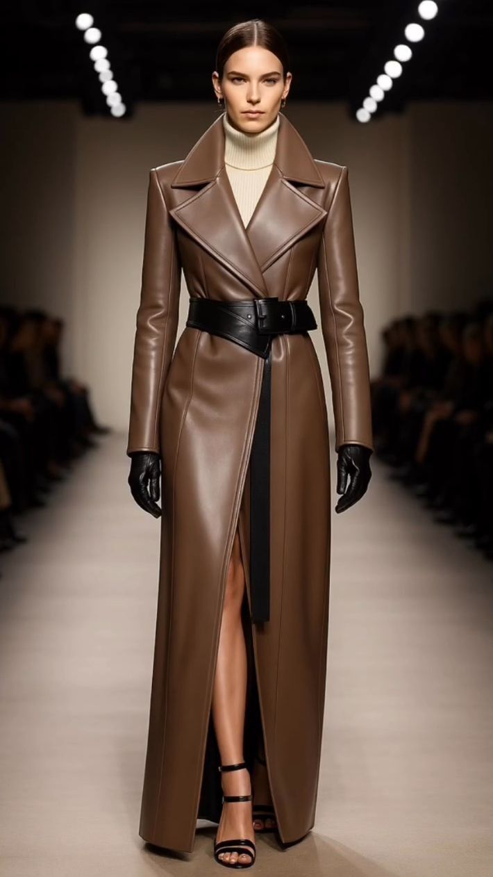 High-fashion leather long coat with runway appeal.