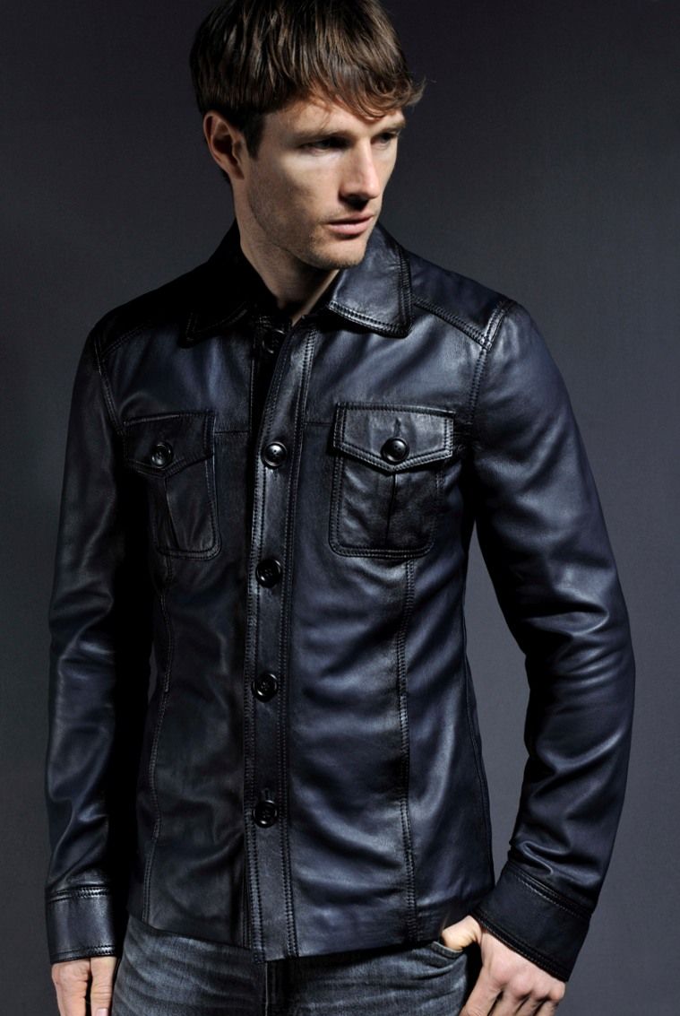 Classic button-down leather shirt with a vintage appeal, ideal for smart-casual wear.